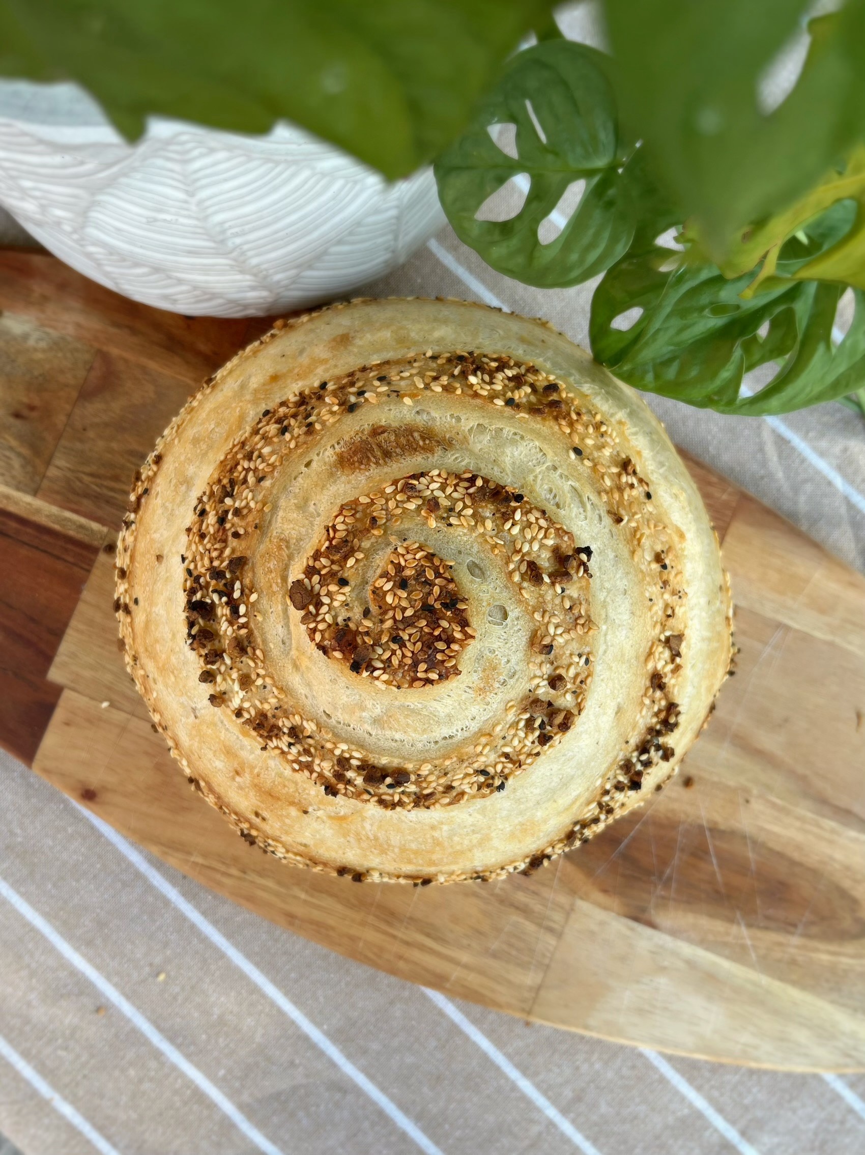 A tantalizing twist on a beloved classic this loaf is coated in a savoury blend of sesame seeds, poppy seeds, garlic, onion, and salt. Each bite is bursting with flavour and nostalgia. With a golden crust and a chewy, fragrant crumb, this loaf brings the iconic taste of an everything bagel to your breadbasket. Ingredients: flour, water, salt, everything seasoning (chopped garlic, minced onion, coarse sea salt, blue poppy seeds, white sesame seeds, black sesame seeds, canola oil), Doughlene (sourdough starter).